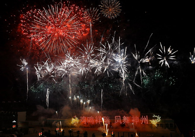 整场焰火晚会分“鸡鸣祥瑞凤舞神州”、“光明圣景”、 “圣农腾飞”、“再创辉煌”四个乐章。一条条银色飞龙在空中漫天飞舞,清脆的鸣叫声响彻夜空,预示着又一年春天的到来。梦幻神奇的彩色花束,异彩纷呈的光柱,五光十色的焰火,构成一幅幅激情四射、层次分明的动感组合,与圣农多姿多彩的夜景交相辉映,给人壮观震撼而又清纯靓丽的感觉。