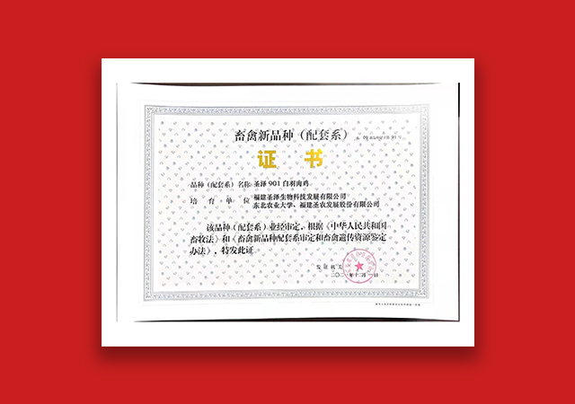 2021年10月18日,第三届国家畜禽遗传资源委员会在北京召开第五次全体会议,圣农集团SZ901作为自主培育白羽肉鸡新品种通过国家畜禽遗传资源委员会审定,并按照程序向社会公示。11月26日,公示结束,SZ901白羽肉鸡新品种正式通过农业农村部审定彻底解决中国白羽肉鸡种源“卡脖子”问题,有力地保障中国粮食安全。